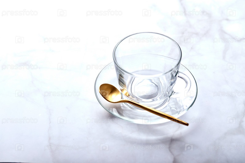 Пустая стеклянная чашка на блюдце с золотой ложкой на светлом мраморном столе