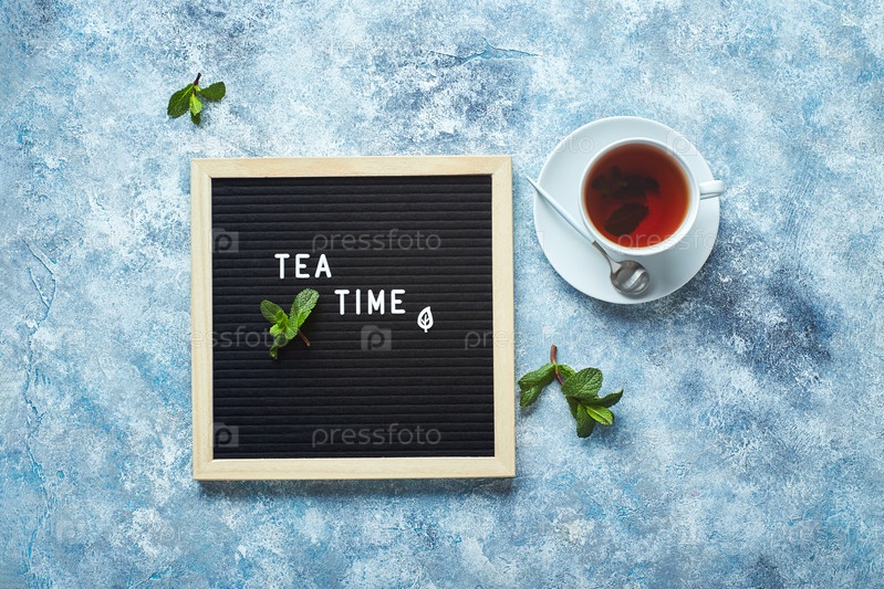 Время чая. Черная доска для писем с текстом на синем столе со стеклянной чашкой чая с листьями мяты
