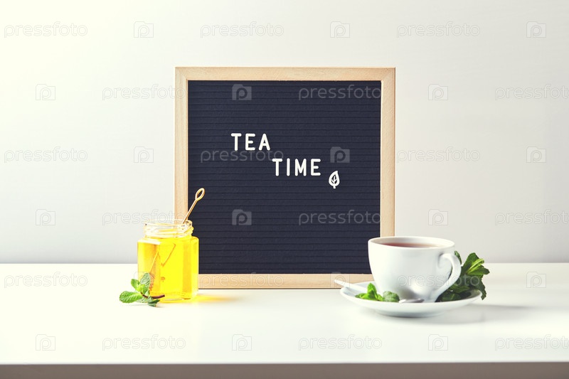 Время чая. Черная доска для писем с текстом на столе со стеклянной чашкой чая с листьями мяты