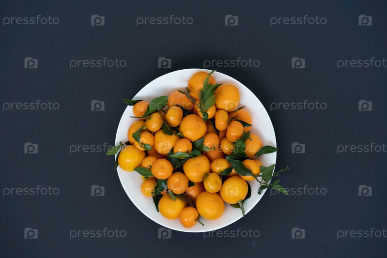 Желтые мандарины лежат на тарелке
