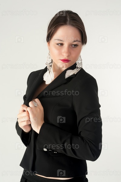 Портрет элегантно одетой молодой великолепной брюнетки в черном костюме