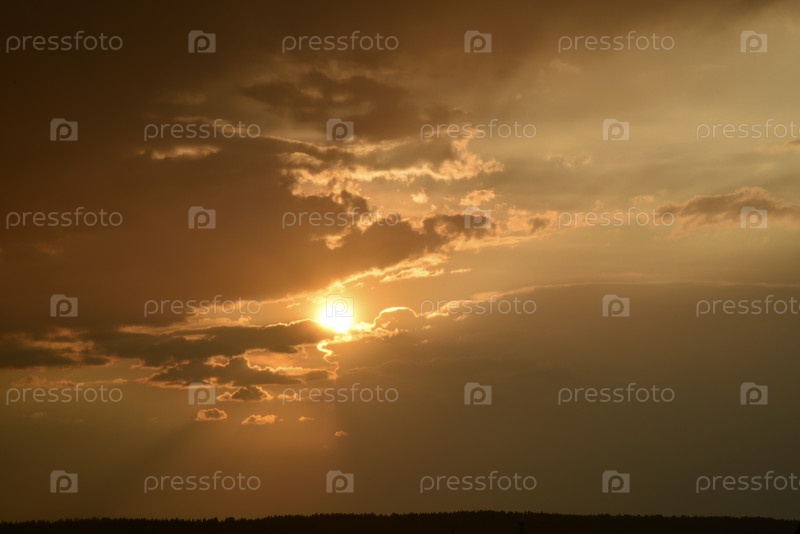Бурный закат. Желто-голубые облака и заходящее солнце