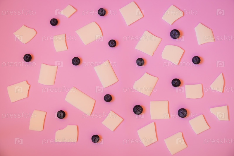 Красочный пищевой узор из черники и белых шоколадных чипсов на розовом фоне