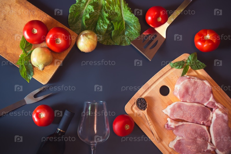 Свежее сырое мясо свинины, бутылка красного вина, бокал и овощи на темном фоне