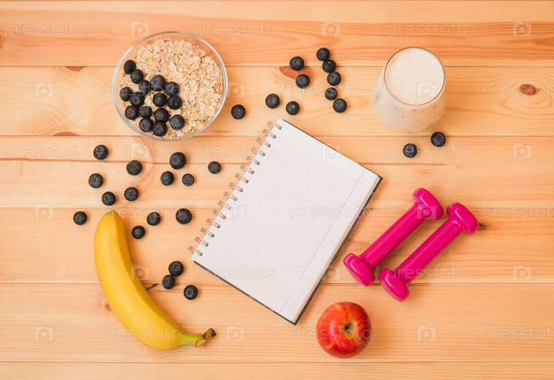 Стакан йогурта, банан, черника, яблоко, овсяные хлопья, блокнот и гантели на деревянном фоне