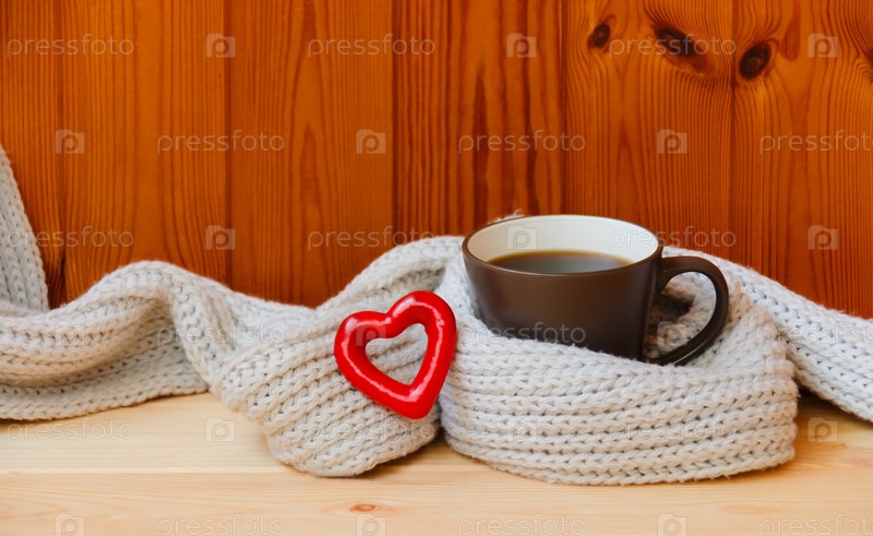 Коричневая кружка кофе, серый шарф и красное сердце на деревянном фоне. Выборочный фокус