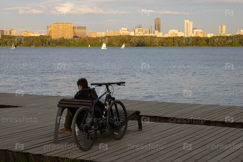 Мужчина отдыхает на берегу Строгинского залива. Москва