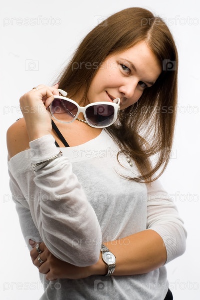Портрет красивой молодой женщины в свитере на белом фоне