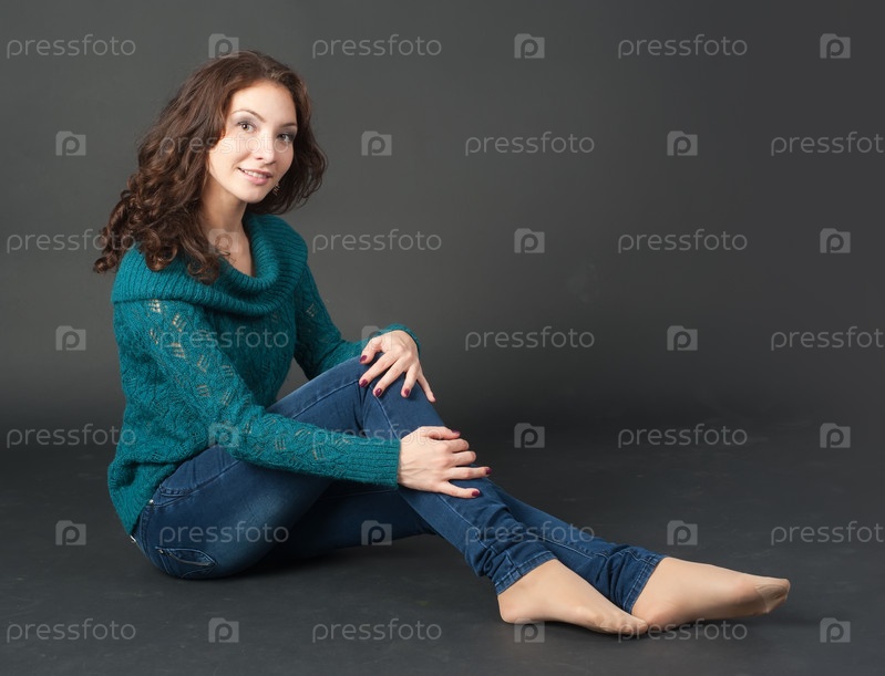 Портрет красивой молодой женщины в свитере на белом фоне