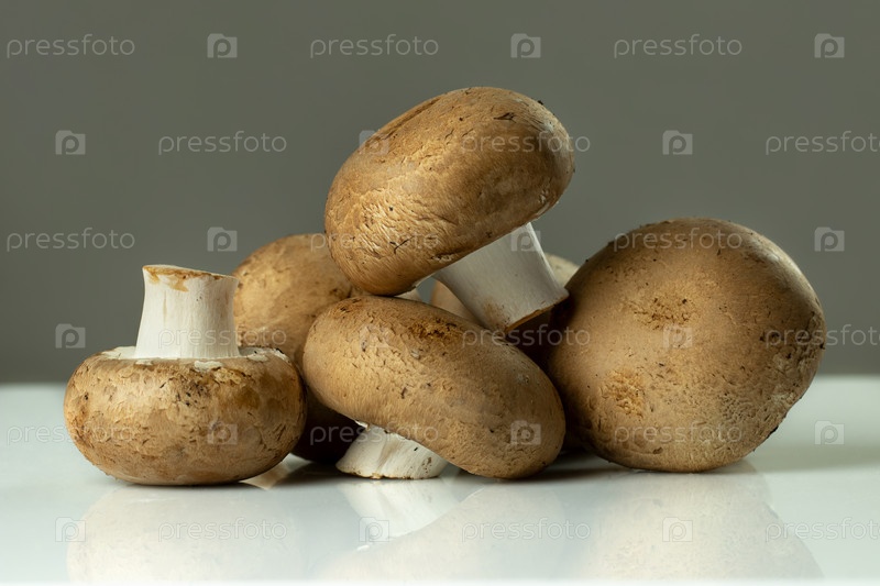Крупные коричневые королевские шампиньоны, готовые к приготовлению. Отражающая белая поверхность и серый фон