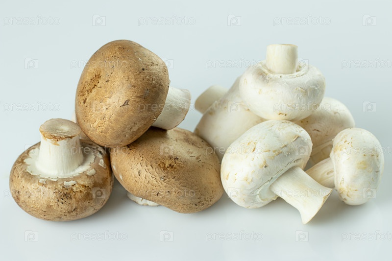 Крупным планом белые и коричневые королевские шампиньоны на светлом фоне