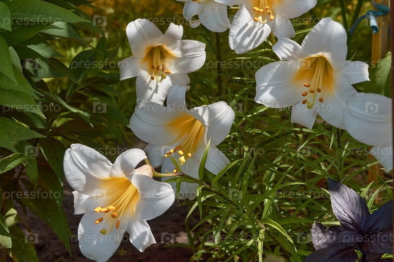 Белые лилии растут в летнем саду