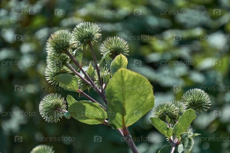Зеленые шипы цветущего лопуха с бутонами и шипами