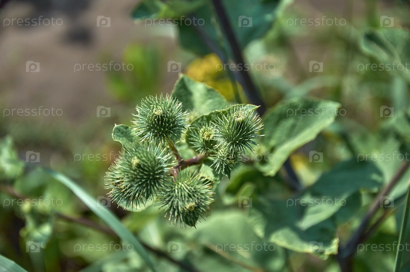 Красивое зеленое растение лопуха с бутонами и шипами