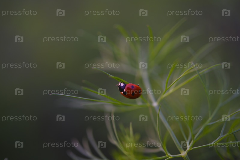 Красный жук. Божья коровка на листьях укропа