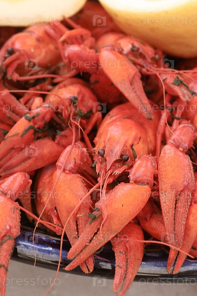 Вареные раки. Разложить на большом блюде. Крупный план