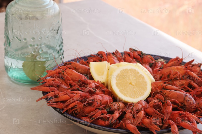 Вареные раки. Разложить на большом блюде. Украшен дольками лимона. Крупный план