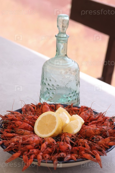 Вареные раки. Разложить на большом блюде. Украшен дольками лимона. Крупный план