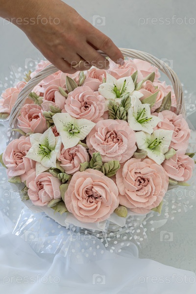 Зефирный букет цветов в плетеной корзине на светлом фоне