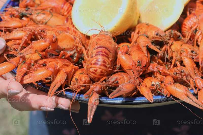 Женщина держит в руках большое блюдо с вареными раками. Украшен дольками лимона. Крупный план