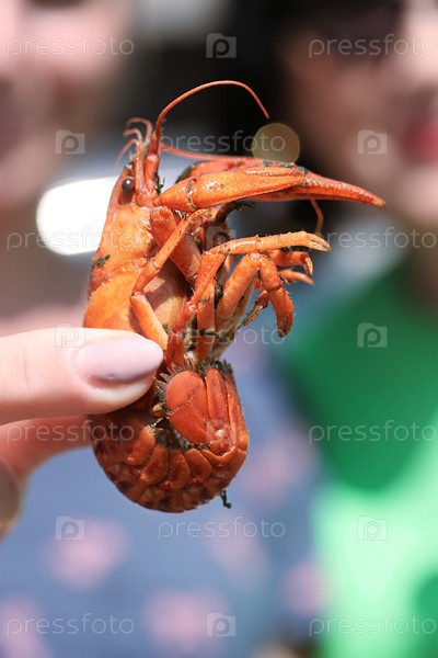 Женщина держит в руке вареных раков. Крупный план