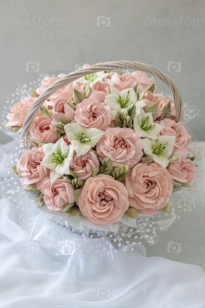 Зефирный букет цветов в плетеной корзине на светлом фоне