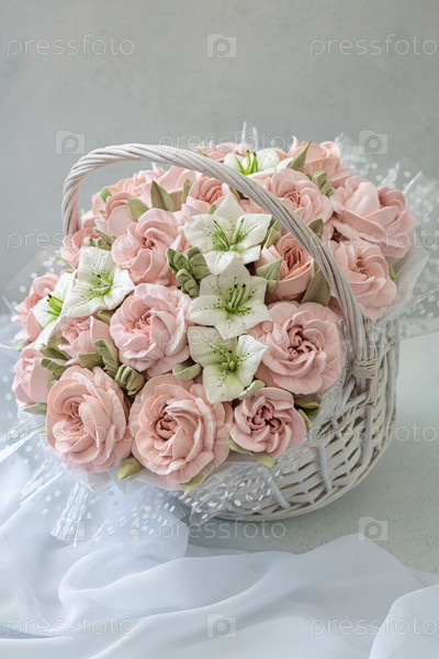 Зефирный букет цветов в плетеной корзине на светлом фоне