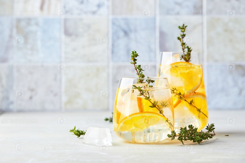 Освежающий коктейль со льдом, апельсином и тимьяном. Освежающий летний домашний алкогольный или безалкогольный коктейль или моктейль или ароматизированная вода на основе Детокса