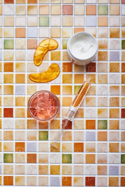 Баночки с кремом и гелем для ухода за лицом и телом, золотые повязки для глаз и золотая сыворотка в шприц-тюбике на фоне плиточной мозаики. Модные товары года. Концепция здоровья и хорошего самочувствия