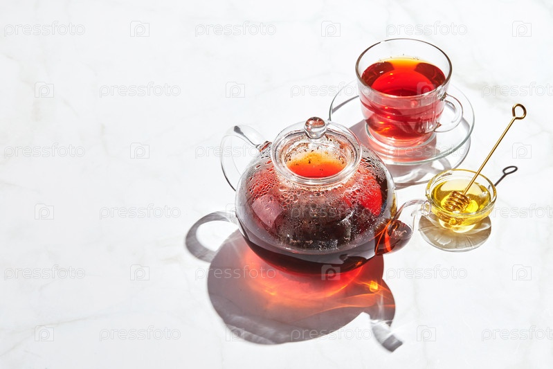 Фруктовый чай с яблоками, тимьяном и медом в стеклянном чайнике и чашке на белом фоне с жесткими тенями