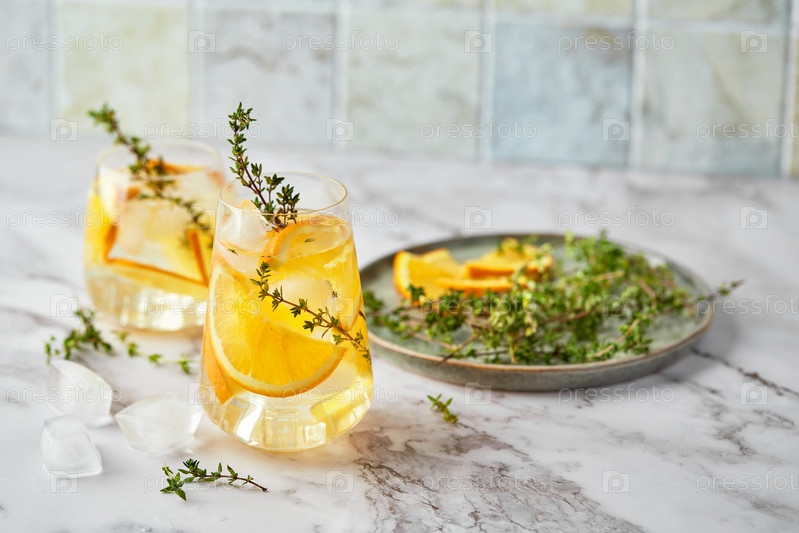 Освежающий коктейль со льдом, апельсином и тимьяном. Освежающий летний домашний алкогольный или безалкогольный коктейль или моктейль или ароматизированная вода на основе Детокса