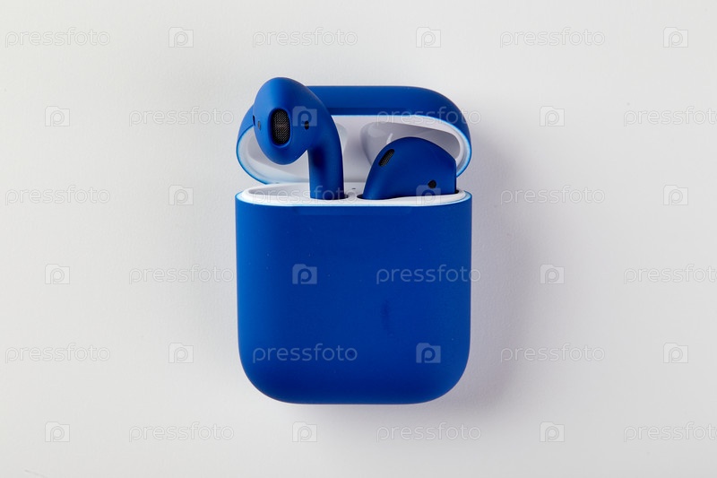 Синие беспроводные наушники в чехле для зарядки крупным планом на белом фоне