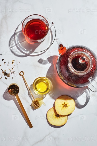 Фруктовый чай с яблоками, тимьяном и медом в стеклянном чайнике и чашке на белом фоне с жесткими тенями
