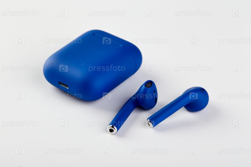 Синие беспроводные наушники в чехле для зарядки крупным планом на белом фоне