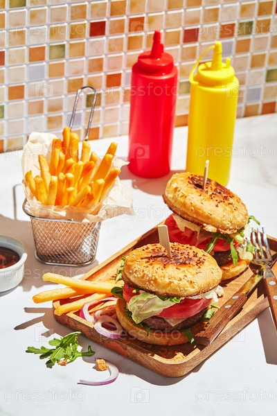 Вкусные домашние гамбургеры на деревянном подносе при ярком солнечном свете. Бургеры с котлетой из телятины, памидором, сыром, красным луком, листьями салата, рукколой и картофелем фри. Концепция быстрого питания