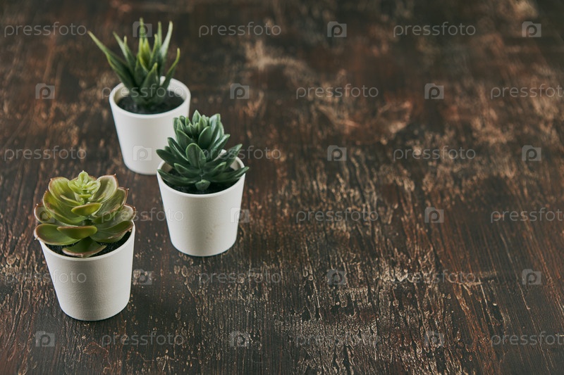 Различные виды эхеверии, сочные комнатные растения хавортия в глиняных горшках на заднем плане. Скандинавское хипстерское украшение дома