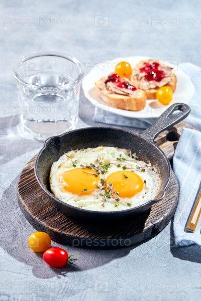 Жареные яйца в чугунных сковородках. Концепция солнечного утреннего завтрака