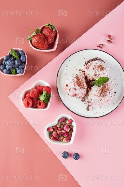 Тарелка с шариками мороженого с ягодами и маленькие тарелки в виде сердечек со свежими ягодами, клубникой, малиной, черникой на розовом фоне. Вид сверху