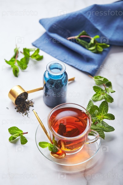 Черный чай в стеклянной прозрачной кружке с листьями мяты. Успокаивающий чай, антистресс