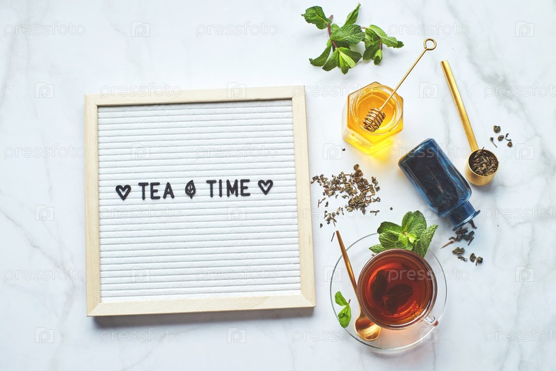 Время чая. Белая доска для писем с текстом на мраморном столе со стеклянной чашкой чая с листьями мяты