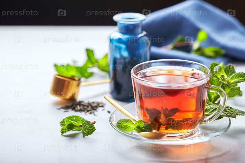 Черный чай в стеклянной прозрачной кружке с листьями мяты. Успокаивающий чай, антистресс
