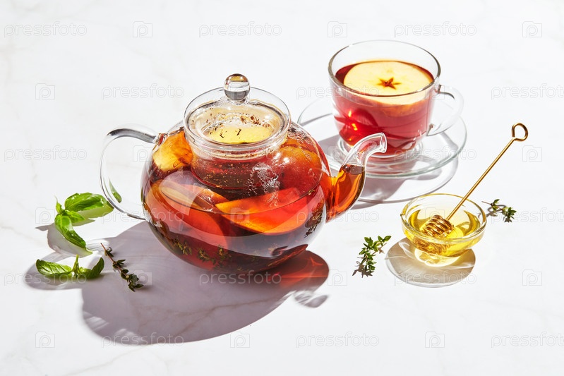 Фруктовый чай с яблоками, тимьяном и медом в стеклянном чайнике и чашке на белом фоне с жесткими тенями