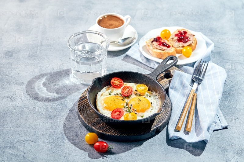 Жареные яйца в чугунных сковородках. Концепция солнечного утреннего завтрака