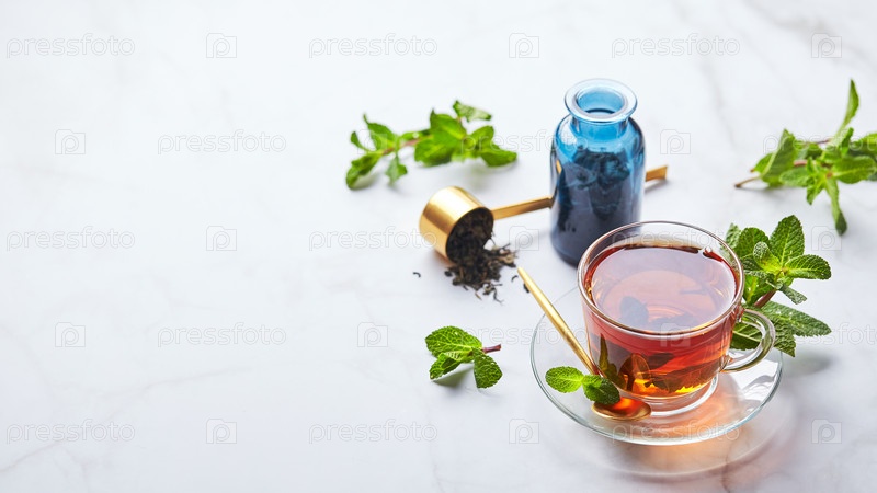 Черный чай в стеклянной прозрачной кружке с листьями мяты. Успокаивающий чай, антистресс