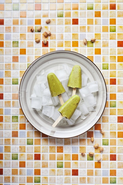 Замороженное домашнее фисташковое эскимо в миске со льдом на мозаичном столе. Освежающее эскимо, замороженный зеленый сок на палочке. Вид сверху, пространство для копирования