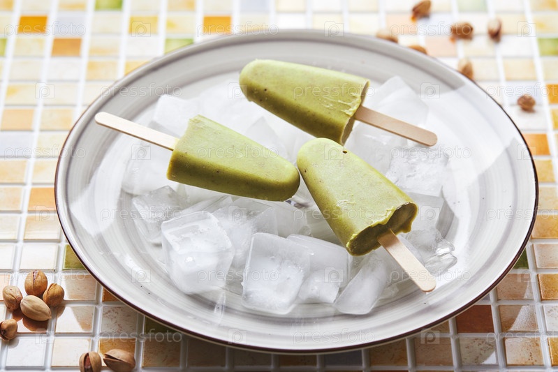 Замороженное домашнее фисташковое эскимо в миске со льдом на мозаичном столе. Освежающее эскимо, замороженный зеленый сок на палочке. Вид сверху, пространство для копирования