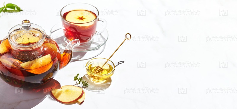 Фруктовый чай с яблоками, тимьяном и медом в стеклянном чайнике и чашке на белом фоне с жесткими тенями