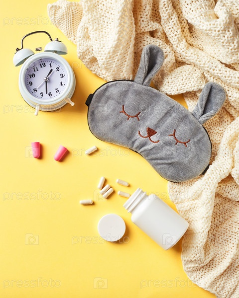 Маска для сна, будильник, затычки для ушей и таблетки на желтом. Креативная концепция здорового ночного сна