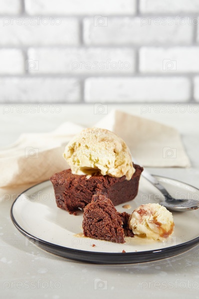 Шоколадный десерт брауни с шариком сливочного орехового мороженого на тарелке с салфеткой