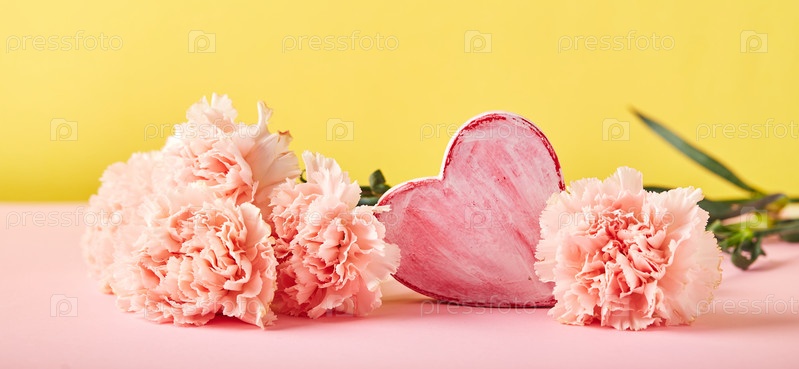 Букет розовых гвоздик и декоративное сердце. Концепция дизайна праздничного поздравления с букетом гвоздик на розовом фоне